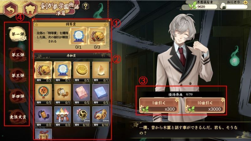 | ① | 第一弾で獲得できるレアアイテム一覧です。 このレアアイテムを規定の数獲得すると、他のアイテムをすべて獲得していなくても次の段階の福引に進むこともできます。 |