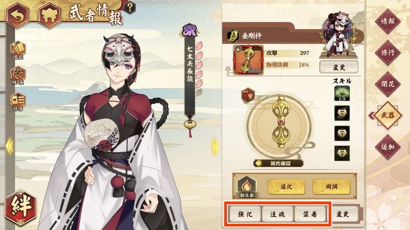 該当武者の武者情報ページにある「武器タブ」から、それぞれ強化や注魂、勾玉の装着画面を表示できます。