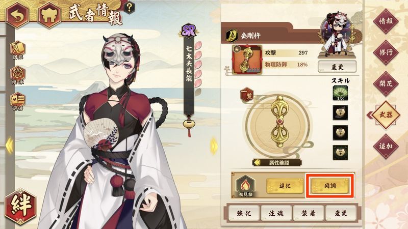 本命武器は、式神のレベルを上げる「同調」と武器そのもののレベルを上げる「進化」でそれぞれ強化することができます。