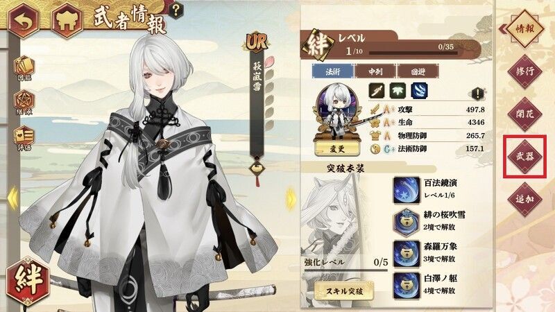 居室から武者一覧画面に行き、装備させたい武者を選択して武者情報画面を表示します。