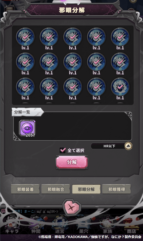 - 邪眼分解で、余った邪眼を分解し、邪眼晶石を入手