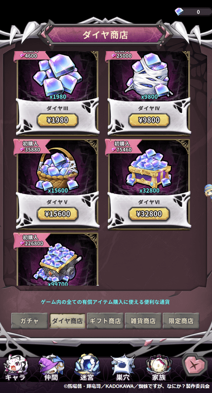 ![]() | ・ホーム画面(ホーム下アイコン) >交換所 >ダイヤ商店 ダイヤ× 1,980/ \1,980- 初回:宝石× 4,600 ダイヤ× 9,800/ \9,800- 初回:宝石× 25,000 ダイヤ×15,600/\15,600- 初回:宝石× 35,880 ダイヤ×32,800/\32,800- 初回:宝石× 75,460 ダイヤ×99,700/\99,700- 初回:宝石×226,800 ※ダイヤはゲーム内限定の通貨 ・ダイヤは、有料のものを、現金の代わりに同額のダイヤで購入できる。 ・ダイヤを購入したほうが、直接現金での支払いよりも、宝石を入手できる分お得 |
