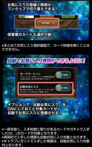 入手したカードを自動お気に入り登録するオプションが追加されました。入手数に限りがあるカードやガチャ産のSS以上のレア度のカード、再契約で入手したカードが対象となります。(一部例外あり)