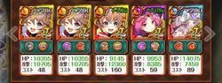 1戦目 開幕ミカエラSS、左タゲで2回攻撃、3T目はアレスちゃんAの火とミカエラ火だけ左、残り右で攻撃 7T目にザッパーと斬撃アレスちゃん後、AS逃しで攻撃。以後斬撃は貯まるたび発動、ヒーロースキルLv2も併用しザッパー2回目も使用 2戦目 GAアレスちゃんABともに変身して中タゲして殴る