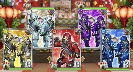 左はデッキに火属性がいると怒り、先制属性特効(火に5000、火以外に5万)&火属性以外吸収(全体500%/99T)