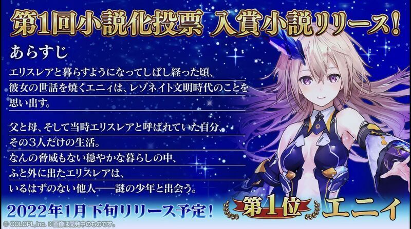 小説化投票の入賞小説としてエニィが主役の小説が2022年1月下旬より公開。
