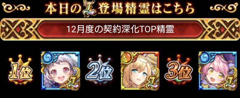 2021年に初実装したガチャ精霊(月別)の契約レベル5達成数TOP3がLで排出されるガチャが日替わりで実施。