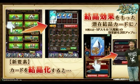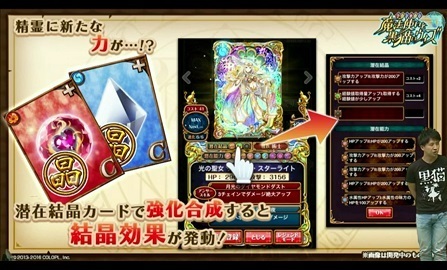 潜在結晶という様々な能力(攻撃力アップ、経験値アップを画像内で確認)を持ったカードを精霊にセットする機能です。