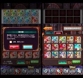 左は、倉庫に入った素材はレベルやマナがリセットされるという注意のポップアップ。