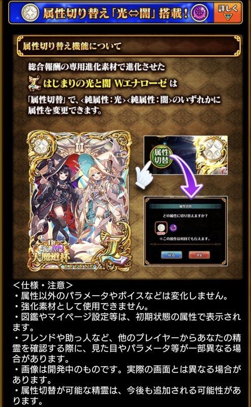 特別なカードと同様、カード詳細画面左上にある「属性切替」ボタンで「純属性:光」と「純属性:闇」を切り替えることができます。