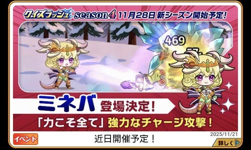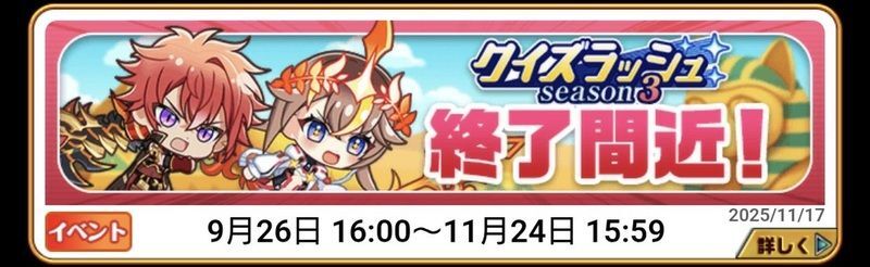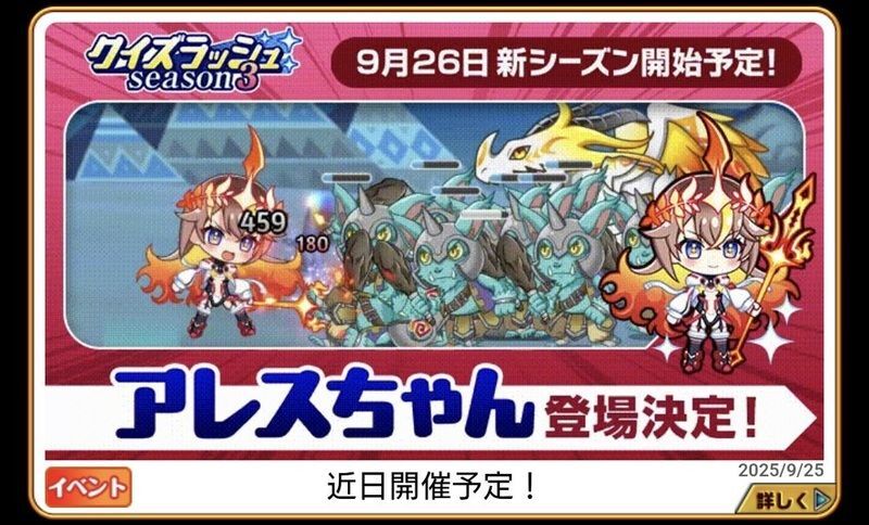 | season3 (2025/9/26~11/24) | ラディウス(火) シエオラ(水) カイン(雷) アレスちゃん(火) | 10 |