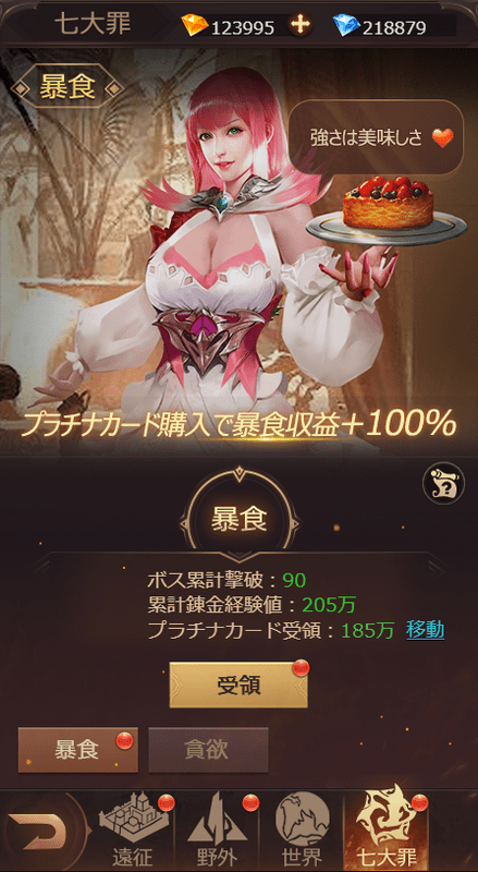 暴食:VIP1になると開放できます。開放すると定期的に大量のEXPがもらえます。