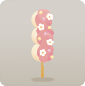 | 放上草莓風味餡料的糰子。以花朵翻糖與糖珠裝飾得相當可愛喔。 | |