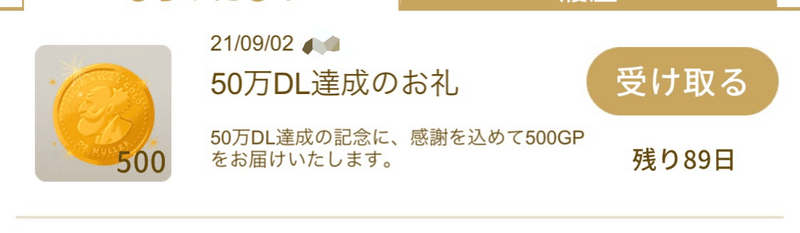 リヴリーアイランド50万ダウンロード達成記念で「500GP」が配られました。