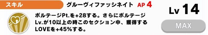 | スキル使用時2回まで セクション中、獲得するLOVEを+102% | |