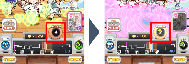 そこでハートの色を上げる方法です。時間経過とスキルによって「ボルテージ」を上げることでハートはピンクに近づきます。