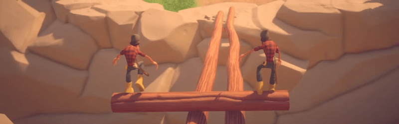 この2人の木こりがやるべきことは、前へ転がり続ける丸太の上でバランスを保つことだけです。