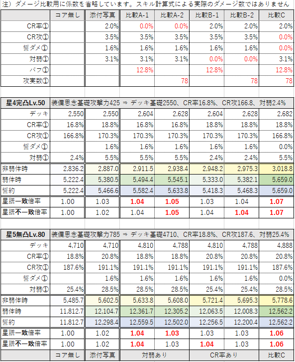 今回は星4完凸Lv.50という仮定で行ったため、実数のBの方がより効果を発揮しました(弱体時は若干下がりますが、時間が長い非弱体時のUPが大きい)。これを星5無凸Lv.60や星5完凸覚醒など育成を進めていくほど、バフが効果を発揮します。限定ガチャの実装順を見て星5の入手がしばらく難しい場合、星3星4には実数値がおすすめです