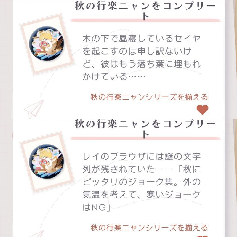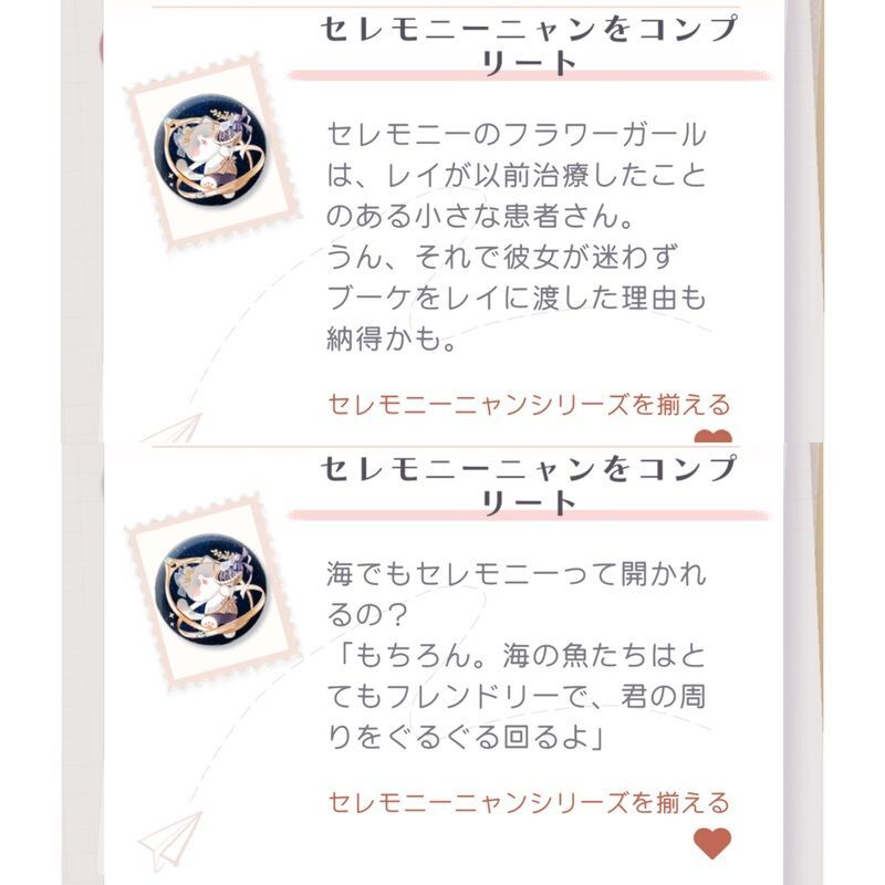 デート「楽しいお出かけ」でニャンニャン抽選機を回すと獲得できるアイテムです。ニャンニャンカードをプレイすると獲得できるニャンコインを使用して回します。「コレクション」から獲得したニャンバッジの全体を見ることができる他、デスクに飾ることができます。