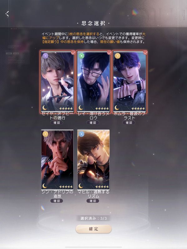 この選んだ3枚が星5思念総合獲得確率75%の「確率アップ対象」となり、確率アップ対象となる3枚はガチャ期間中いつでも変更できます。