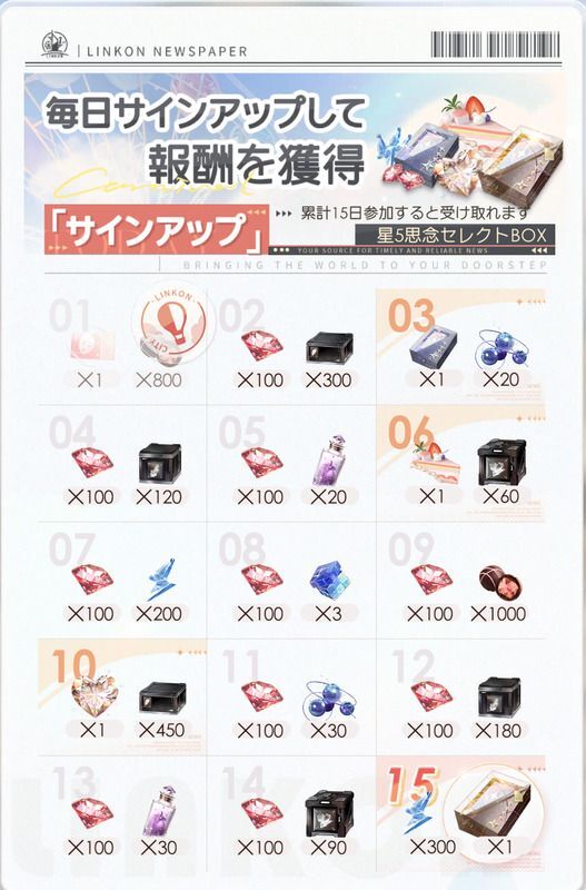 | 15日目 | 礼賛の宝箱・SSR×1 体力×300 |