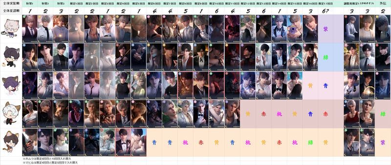 ※セイヤ・降り敷く銀河の調べ、レイ・深まる愛、ホムラ・不思議な巡り合い、シン・沸き立つ灼光、マヒル・帰らぬ夜は調整用限定星3思念のため表から抜いています。