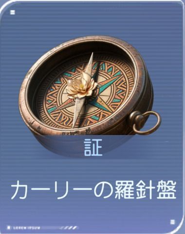 [マヒルの証アイテム]![]() カーリーの羅針盤 | 詳細:伝統的なタナカーリーの羅針盤。どこに居ても、ジャングルへの道を示してくれる。 「彼は、ずっと、あなたの帰る場所であり続けることを願っている。」 |