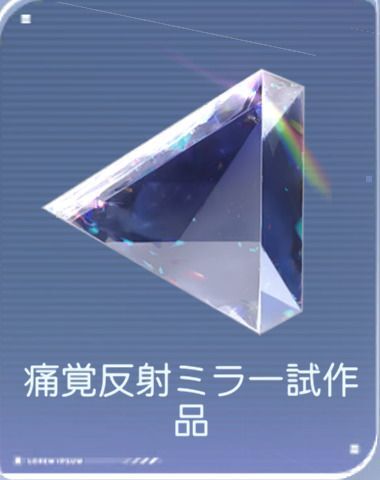 [試作品アイテム]![]() 痛覚反射ミラー試作品 | 効果:このアイテムを獲得すると、その後2回の戦闘でイテレーション最適化を行う。最適化中は、あなたとパートナーの被ダメージが30%アップする。最適化完了後、あなたとパートナーの与ダメージが永続的に10%アップする。 「苛烈な一撃を受け、致命的な一撃を返す。」 |