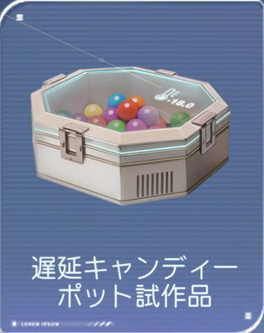 [試作品アイテム]![]() 遅延キャンディーポット試作品 | 効果:このアイテムを獲得すると、その後2回の戦闘でイテレーション最適化を行う。最適化中は、アクティブスキルのクールタイムが5秒延長される。最適化完了後、アクティブスキルのダメージが80%アップする。 「スロースターターなキャンディー。たくさん溜めてゆっくり発揮。」 |