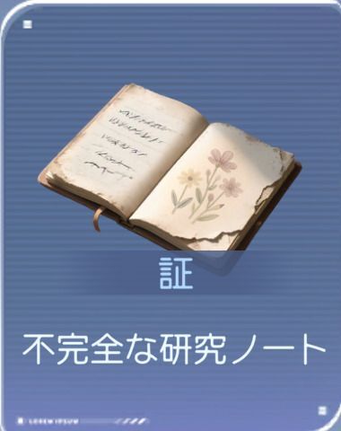 [レイの証アイテム]![]() 不完全な研究ノート | 詳細:欠けた部分がある研究ノート一冊。執筆者はそれを深空学会のとある観測点近くに残し、誰かに発見されるのを待った。署名はサディア。 「真理の最終の1ページ。穏やかな今日に、あなたへ小さな花を一輪贈る。」 |