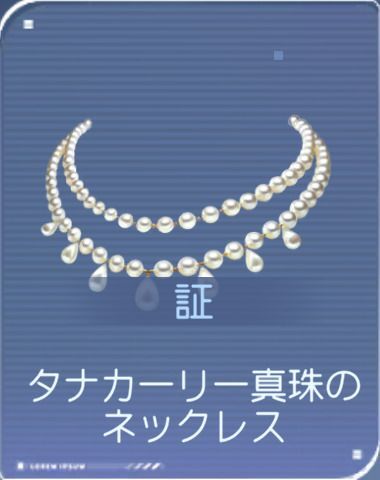 [シンの証アイテム]![]() タナカーリー真珠のネックレス | 詳細:タナカーリー島特製の真珠のネックレス。島で最も有名な宝石店の逸品を、ある客がひと目で気に入り購入した。 「彼があなたに選んだネックレス。それはまだ始まっていない不思議な物語。」 |