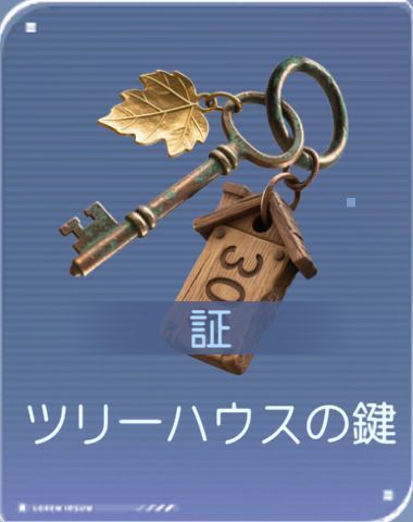 [マヒルの証アイテム]![]() ツリーハウスの鍵 | 詳細:鍵のあるツリーハウスの鍵。ふたりだけの一時的な秘密基地の扉を開ける。 ふたりだけの秘密基地。ふたりだけの思いがけない喜び。 |