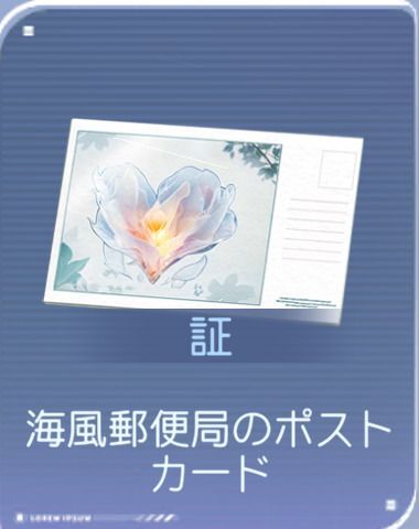 [ホムラの証アイテム]![]() 海風郵便局のポストカード | 詳細:タナカーリー島の風景が印刷されたポストカード。販売元は海風郵便局。 彼が潮風と想いを書いた。あなたが手紙を受け取るその日まで。 |