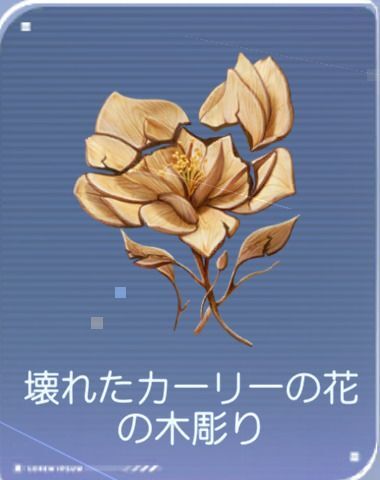 ![]() 壊れたカーリーの花の木彫り | 効果:味方全体の最大HPが5%ダウンする。 「壊れた木彫り。かつての精巧さがわずかに見て取れる。」 |
