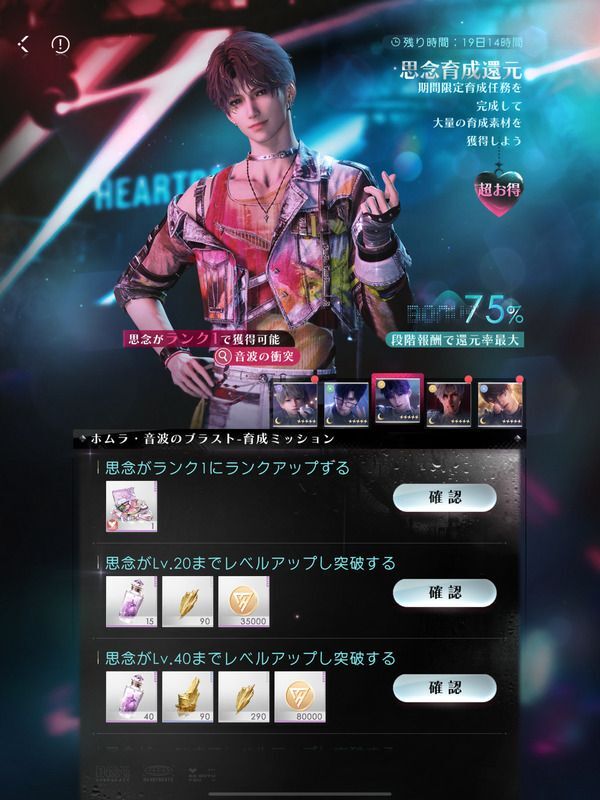 イベント期間中、上記の限定星5思念の指定された育成任務をクリアすれば、大量の思念レベルアップと思念突破素材を受け取れます。