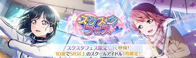 | スクスタフェス? | ![]() ![]() ①強力なフェス限定UR新登場するガチャ ②別学校2人が新登場UR (稀に3人やニジガク2人あり) ③過去フェス限定URも登場(1枚狙いは困難) |