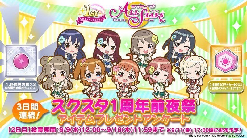 | 2日目 9/9(水) 12:00頃~翌11:59迄 | 84.9% 6属性の珠 各x3 15.1% 6属性のステッカー★2 各x3 https://twitter.com/LLAS_STAFF/status/1303533043731238915 |