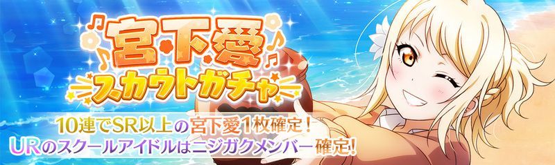 | 情報 | ①10回ガチャで愛のSR以上が1枚確定 ②URはニジガクメンバーのみ ③シャイニークオーツは今後の他ニジガクメンバーのスカウトガチャと合算できる |