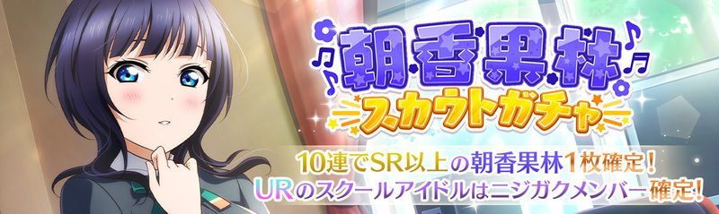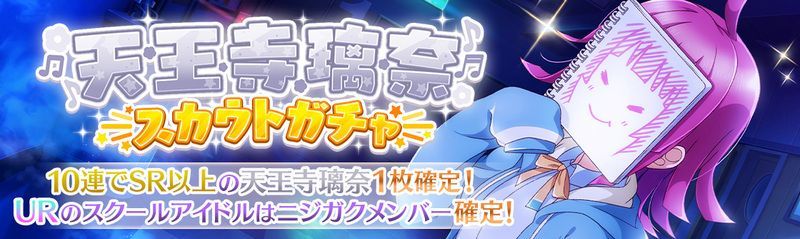| 情報 | ①10回ガチャで璃奈のSR以上が1枚確定 ②URはニジガクメンバーのみ ③シャイニークオーツは今後の他ニジガクメンバーのスカウトガチャと合算できる |