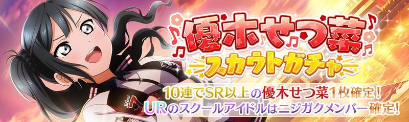 | 情報 | ①10回ガチャでせつ菜のSR以上が1枚確定 ②URはニジガクメンバーのみ ③シャイニークオーツは今後の他ニジガクメンバーのスカウトガチャと合算できる |