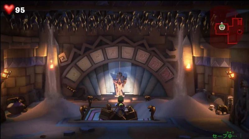 左上の台座など登りにくい場合は砂の吹き出しで道を作る。2体目破壊時にオバケが出るので、グーイージで囮にして3体目を壊すと安全。