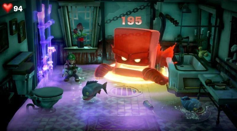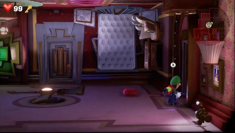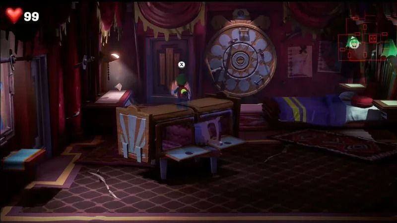 ダークライトで現れた扉の先で宝箱型のオバケが出現。ルイージを吸い込もうとするので気をつけること。元の宝箱に戻すとトビラの鍵を入手できる。