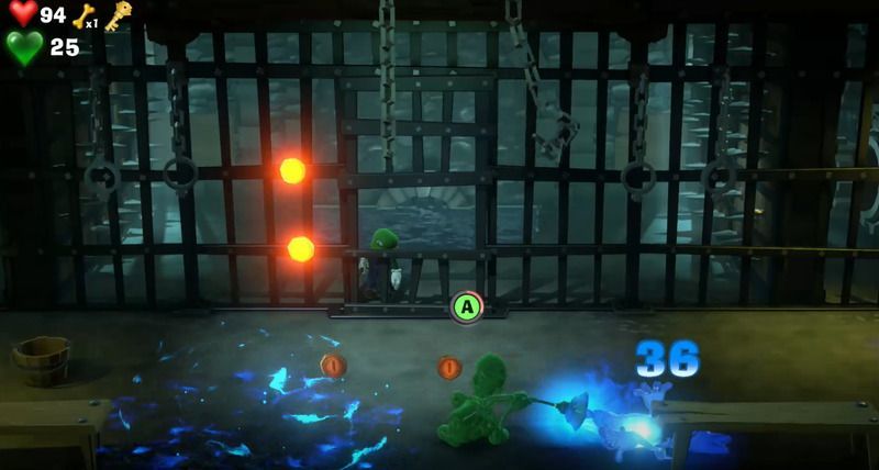 鍵を入手すると、グーイージがオバケに水をかけられて消えてしまう。柵が上がって出れないので再びグーイージで鎖を引っ張ろう。無事に脱出できたら鍵を使い扉に入る。