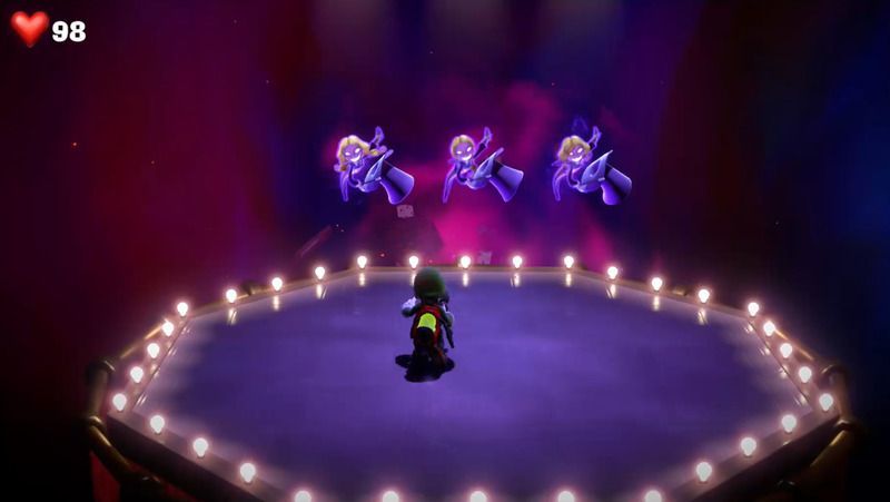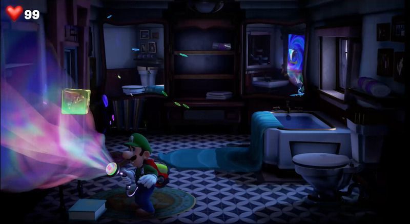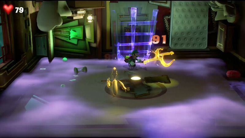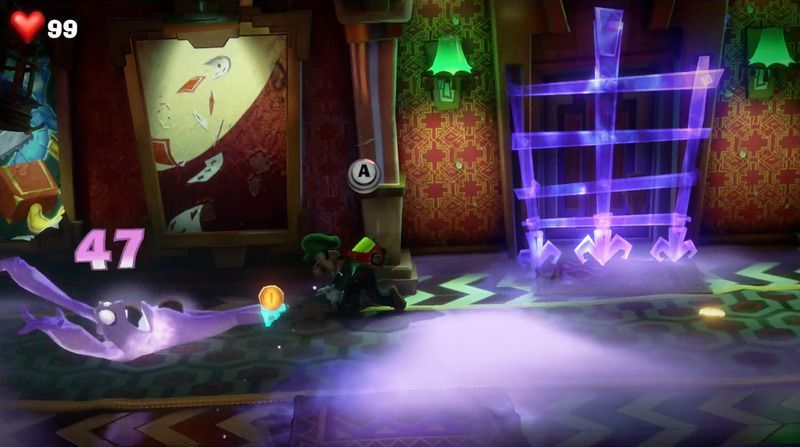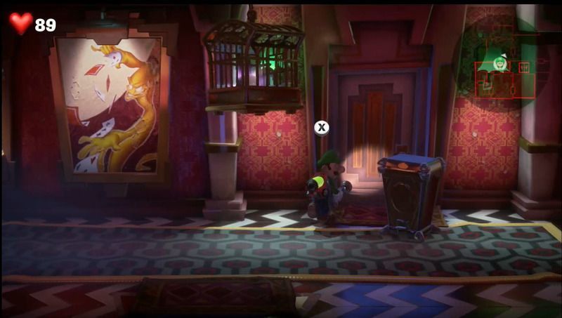 ダークライトで出現させた扉に入ると、部屋の角に宝箱のオバケがいる。ルイージを吸い込んで食べようとするので気をつけよう。元の宝箱に戻すと、トビラの鍵を入手できる。