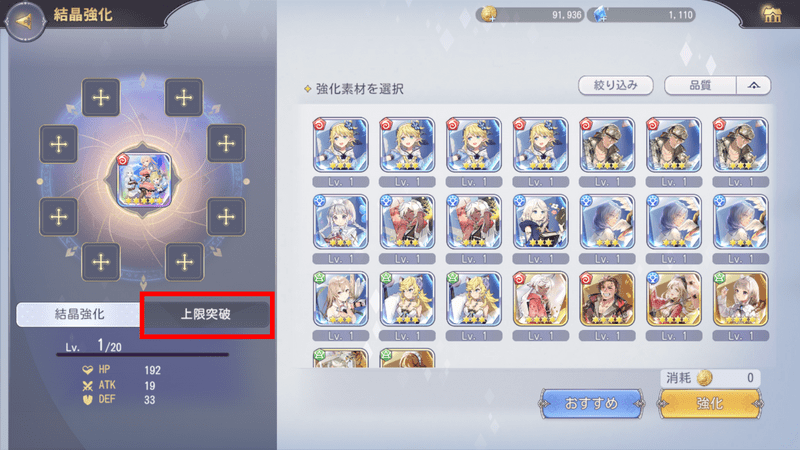 メモリー結晶はレアリティに関わらず初期のレベル上限がLv20に設定されています。同じメモリー結晶または突破素材「○○結晶石」を使用することで4段階まで限界突破が可能でレベル上限もLv10ずつ解放され最大Lv60まで強化できるようになります。