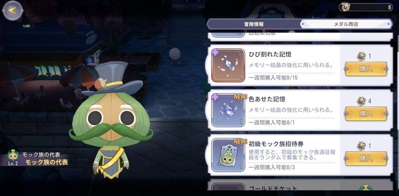 箱庭島にいるモック族に話しかけ、メダル商店のタブで「冒険メダル」と強化素材などと交換することができます。冒険メダルはモック族の事件などで獲得が可能です。