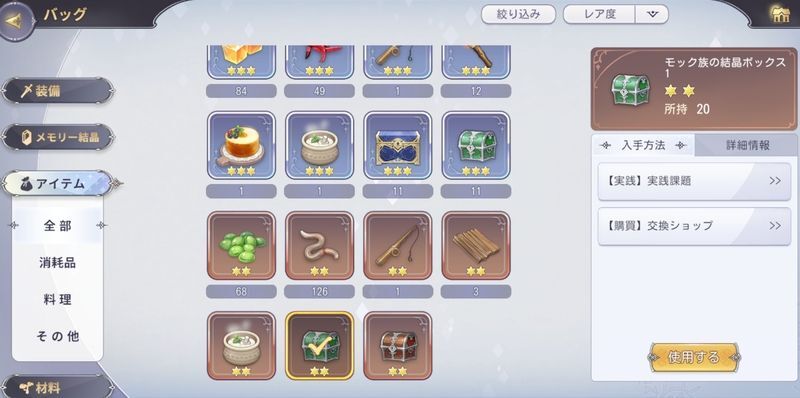 特定の報酬で入手できる「モック族の結晶ボックス」がバックに溜まっている場合は開封することで強化素材を大量に獲得することができます。