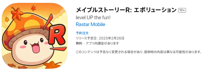 メイプルRのApp Storeのページに記載されたリリース予定日によると、配信日は2025年2月26日となっています。