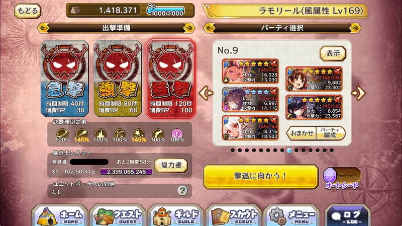 - 一回あたりの出撃時間が短くなる暴走モンスターイベントでは、パーティ全体の攻撃力が上がる、