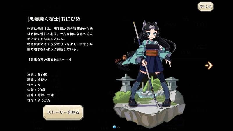 | 進化後:「濡羽髪の槍士」おにひめ 必要素材:水授のつぼみ×15 水授の花×7 | |